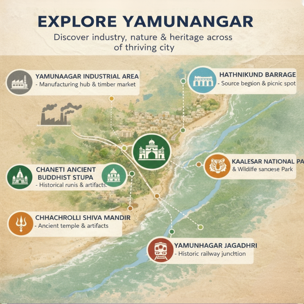 Cultural & Natural Heritage: Yamunanagar beautifully blends industrial strength with natural serenity. Surrounded by forests and wildlife near the Shivaliks, the city celebrates traditional festivals like Navratri, Diwali, and Baisakhi with great enthusiasm. Its spiritual sites, timber markets, and scenic river views make it a unique mix of culture, devotion, and development.